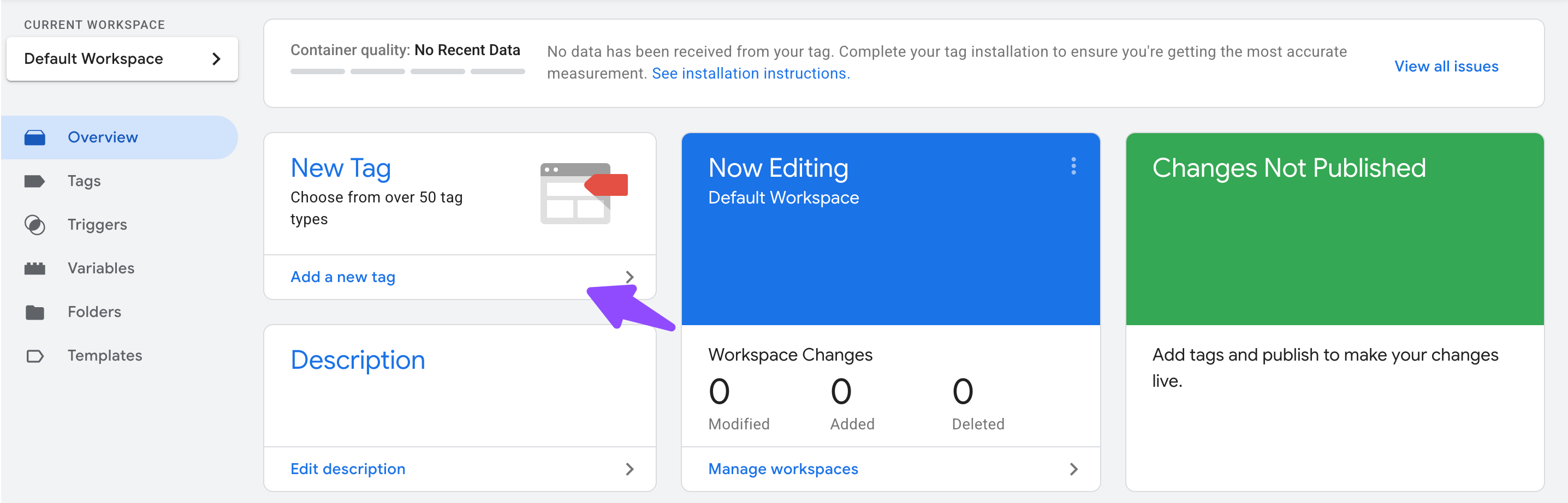 Login to the Tag Manager workspace with your Google account. You will see a workspace similar to the one shown below.