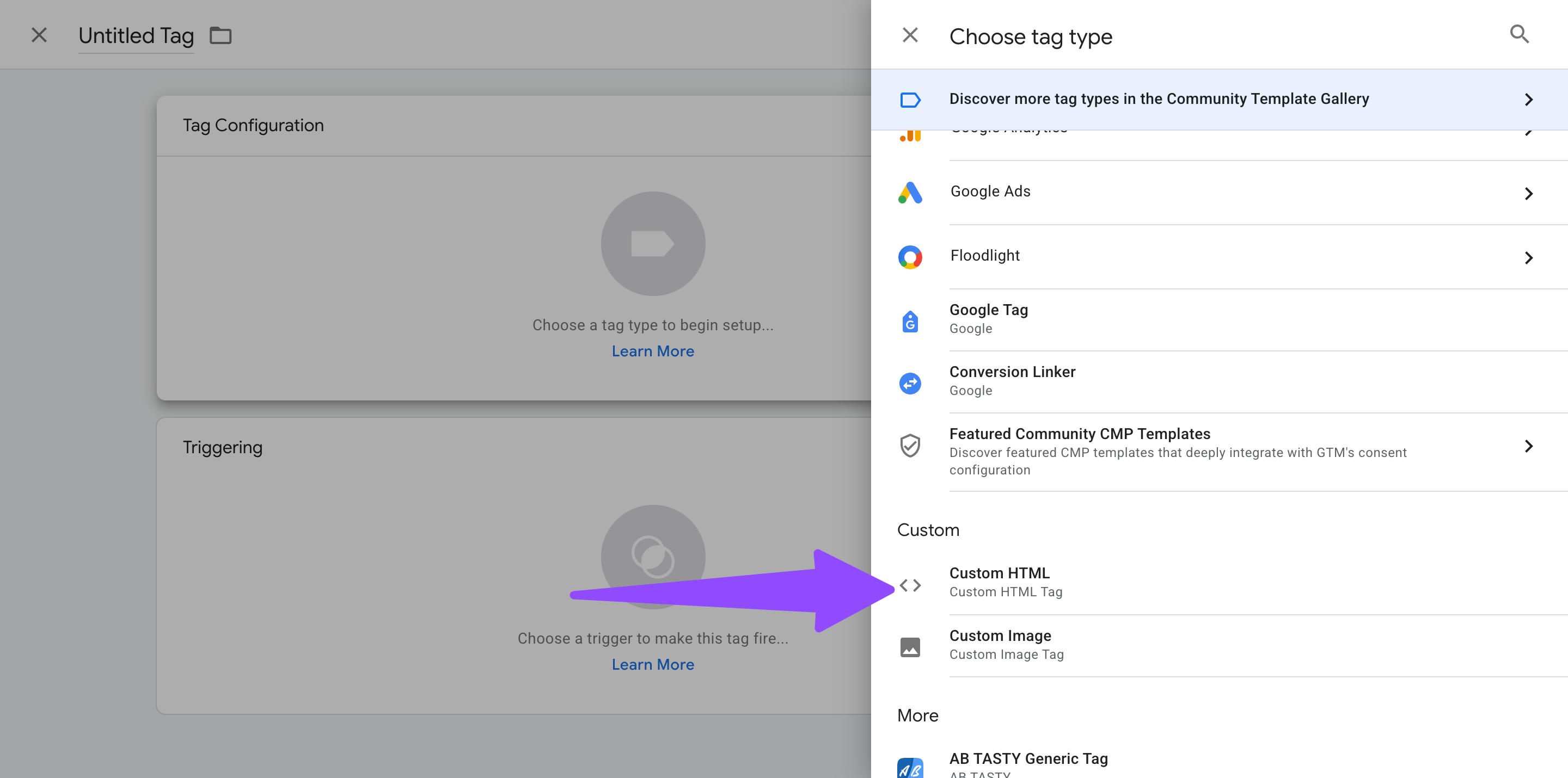 Click on tag configuration, and select the "Custom HTML" tag type from the list.