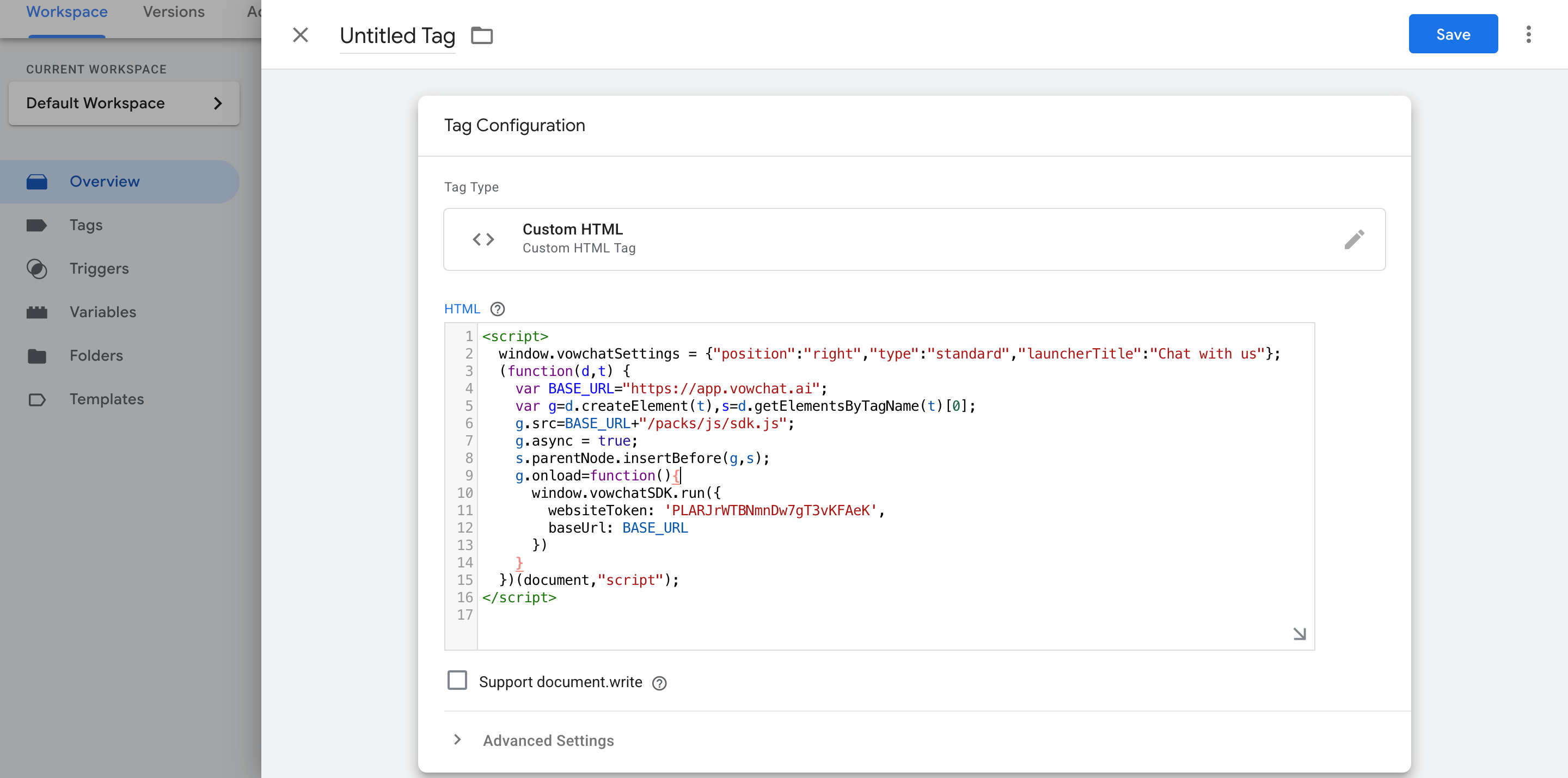 If you are using Google Tag Manager on your website, you can install VowChat from Google Tag Manager's dashboard by creating a new tag for VowChat. To install the VowChat live chat widget, please follow the steps below.