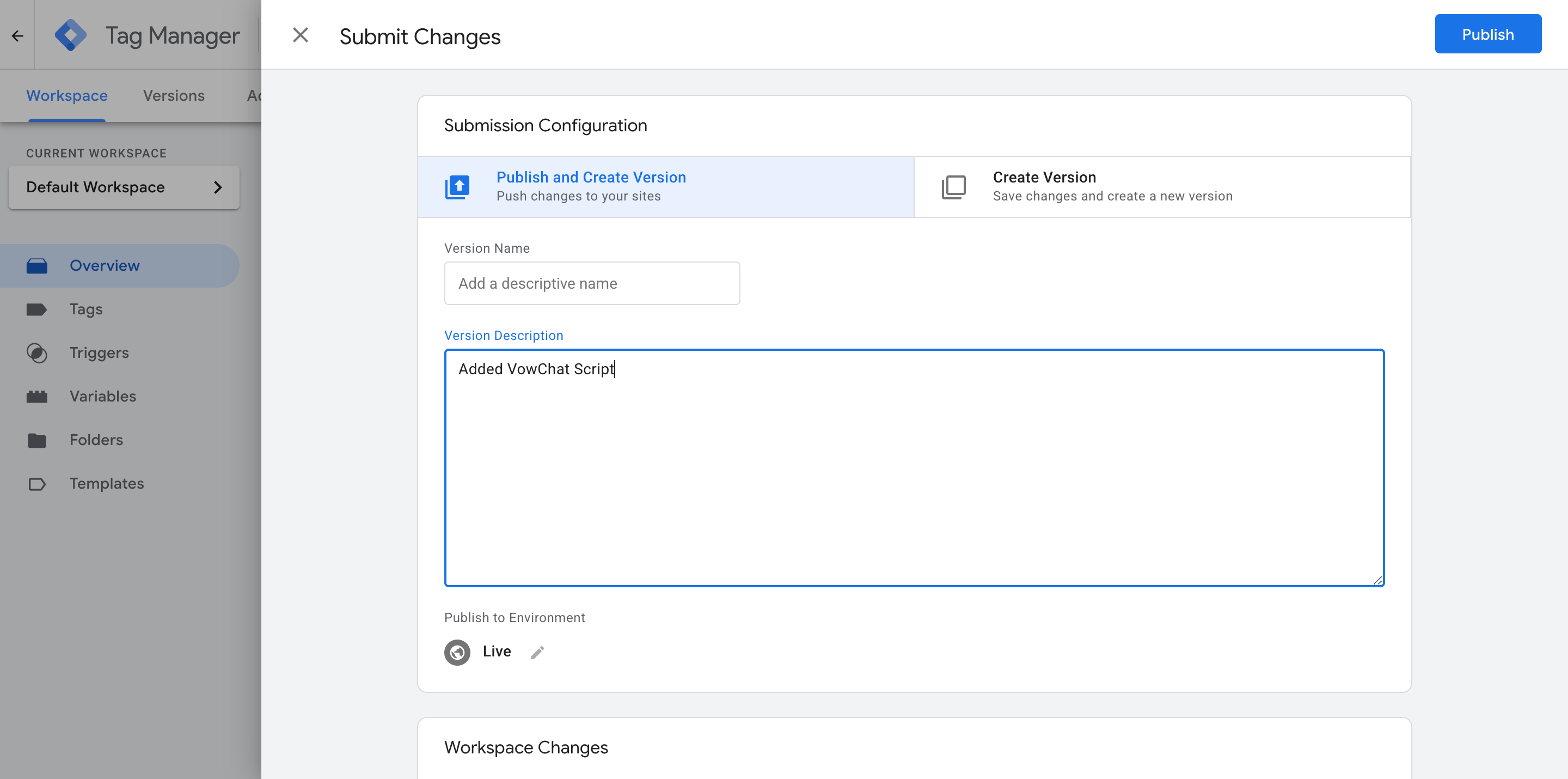 Click on "Submit" to deploy the tag. Provide a version name and deploy the changes by clicking "Publish".