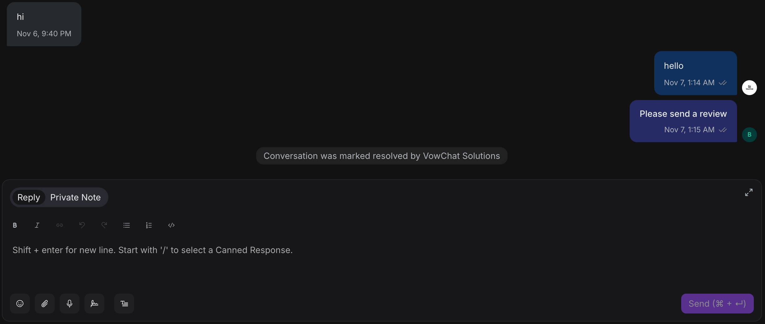 VowChat enables customers to continue chat conversations via email threads, ensuring no conversation is lost even when customers leave the chat.