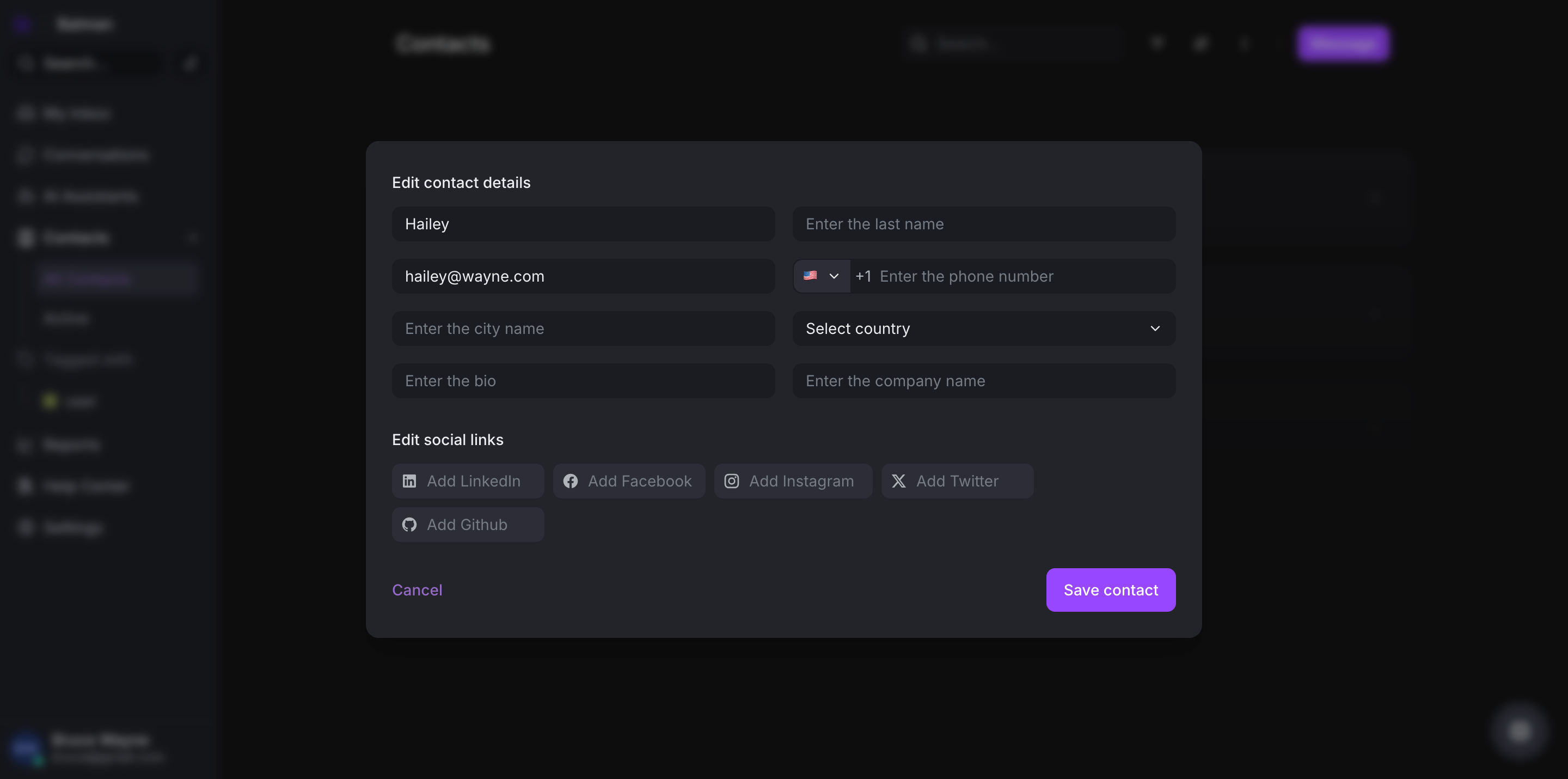 Contacts in VowChat are the people who interact with your business through any of your channels. You can manage contacts manually, import them in bulk, or collect them automatically through pre-chat forms and channel greetings.