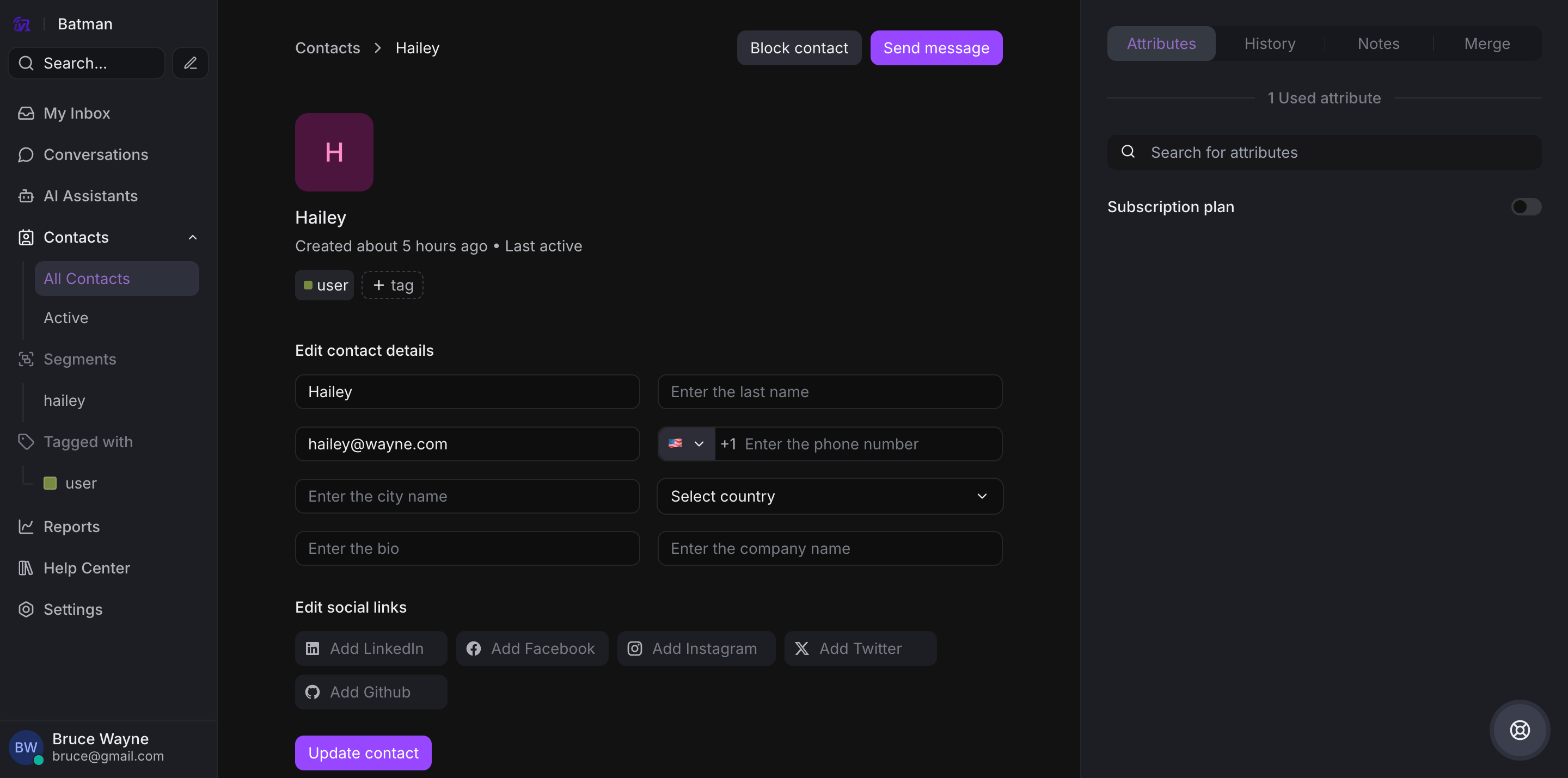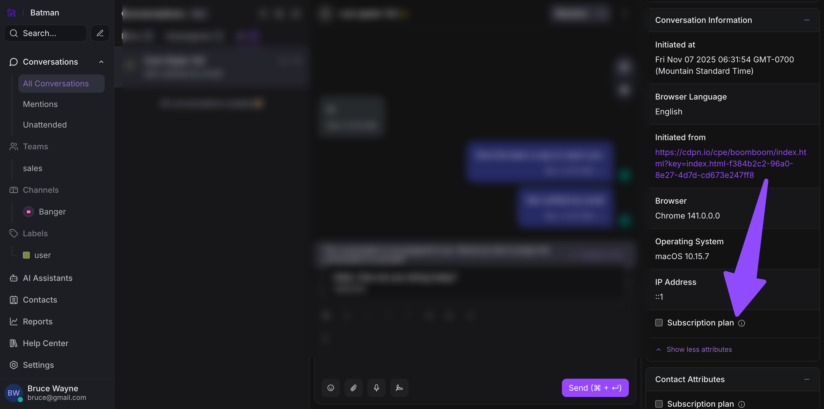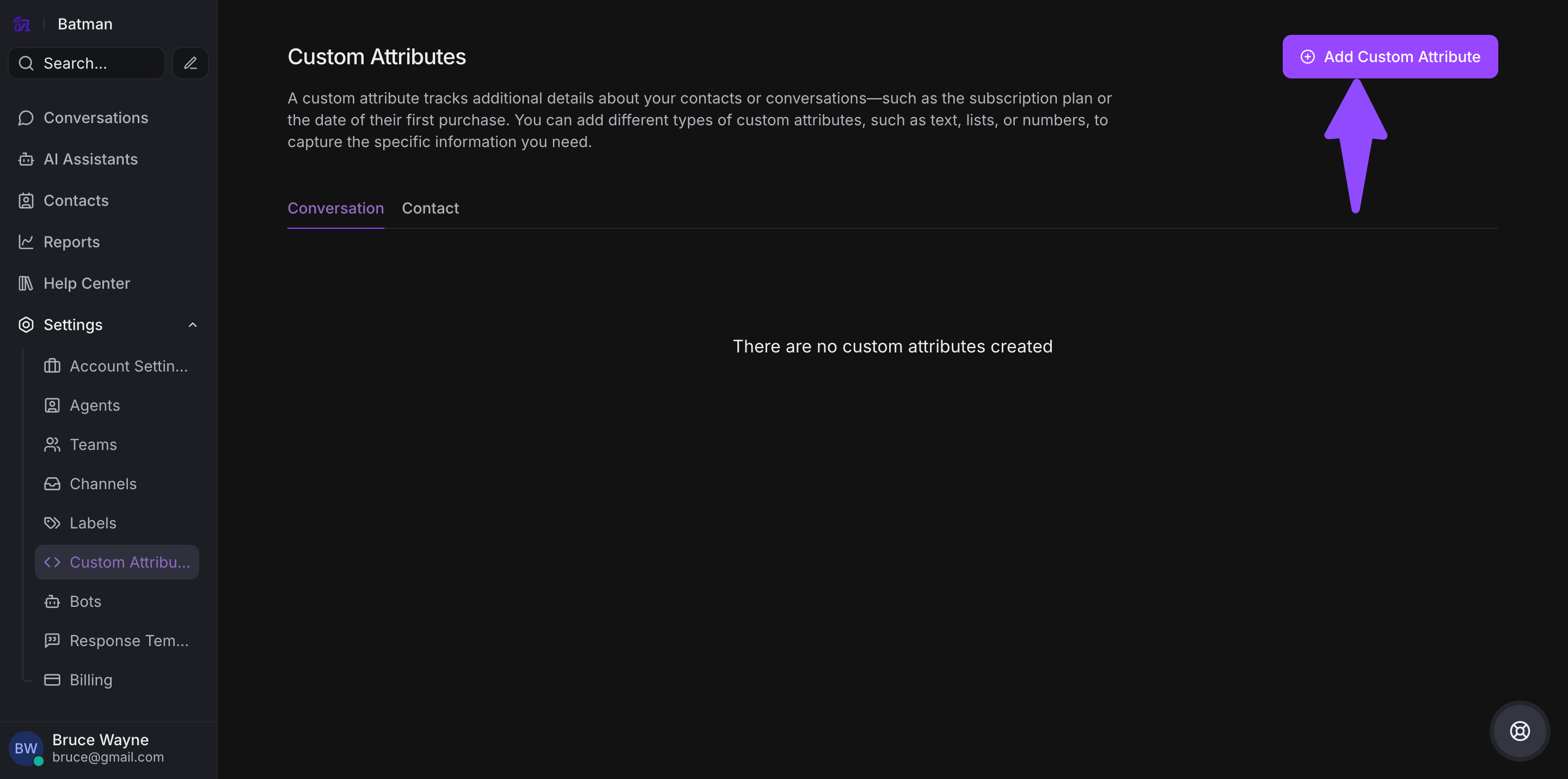 VowChat allows you to track additional information about conversations and contacts through custom attributes. These can include details like subscription plan, signup date, last transaction date, or any other data relevant to your business.
