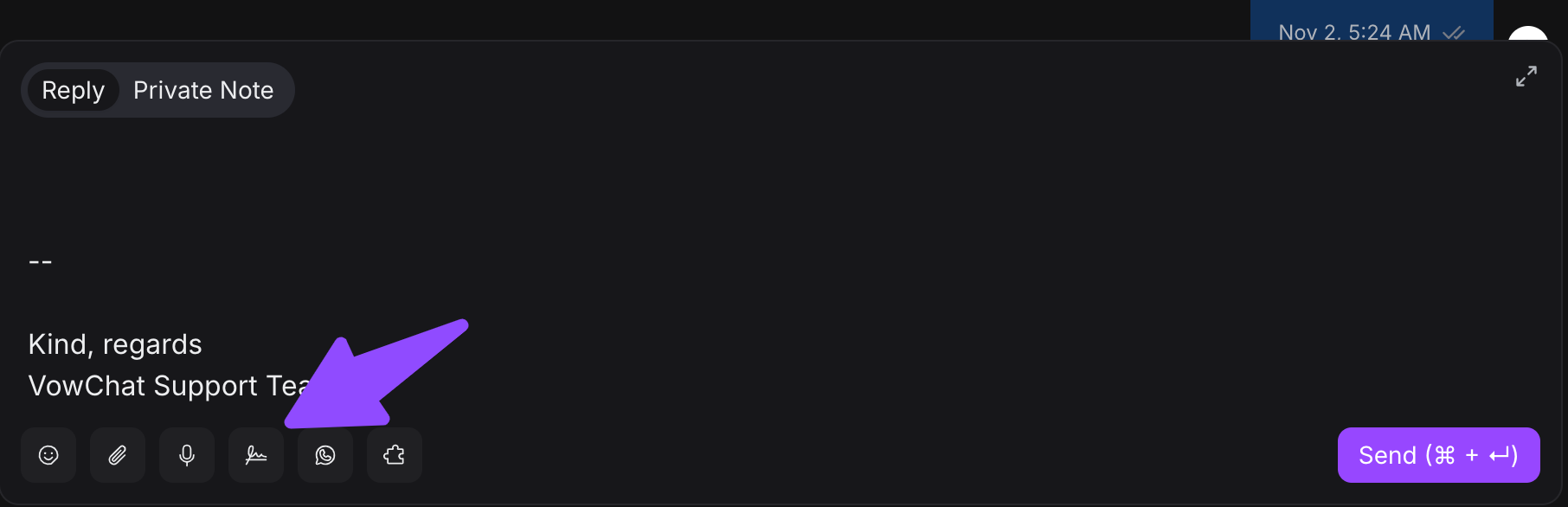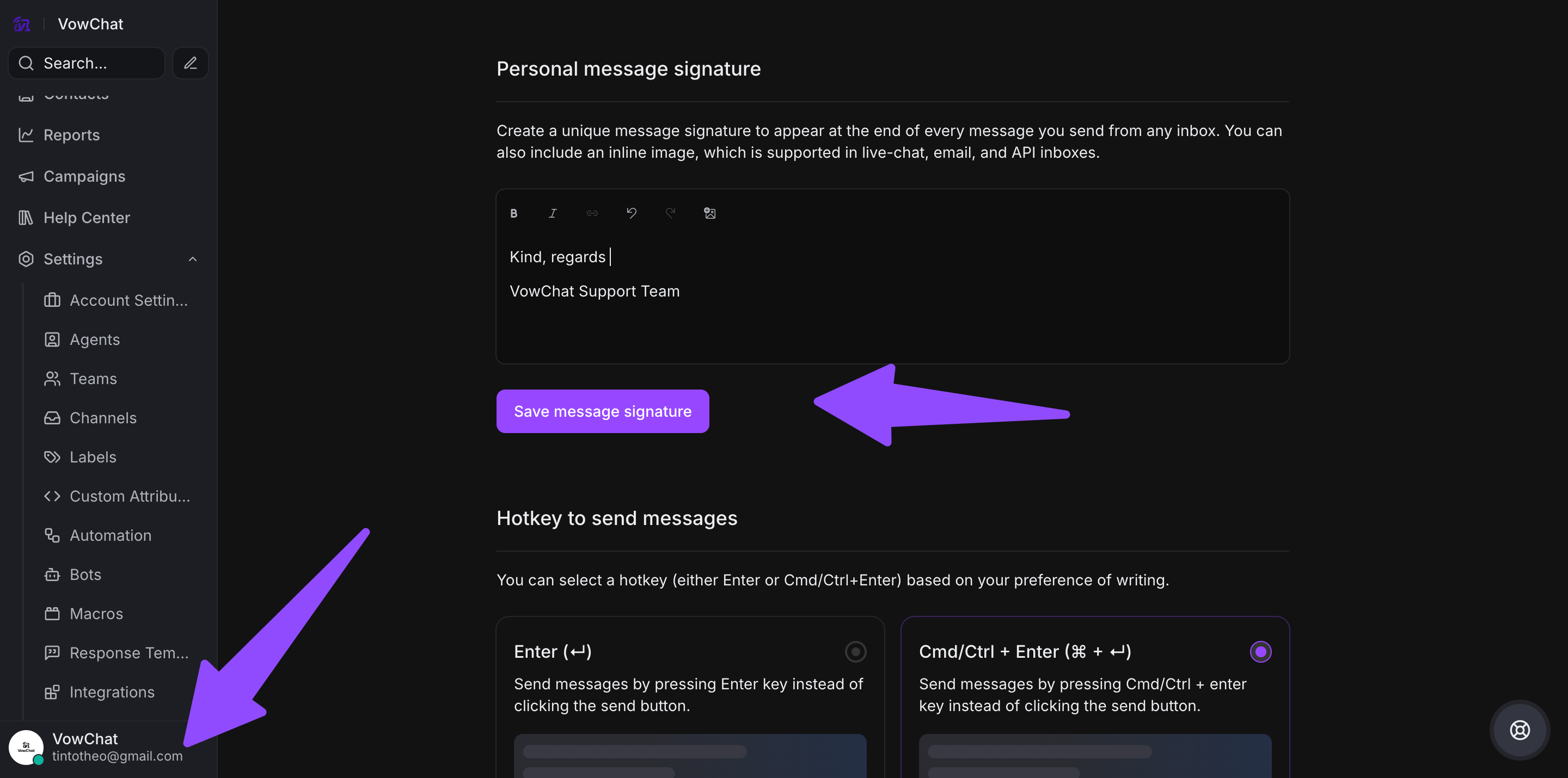 A message signature in VowChat is a personalized sign-off that can be used across all channels, not just emails. Agents can create and customize their signature with rich text formatting to add a professional touch to their messages.