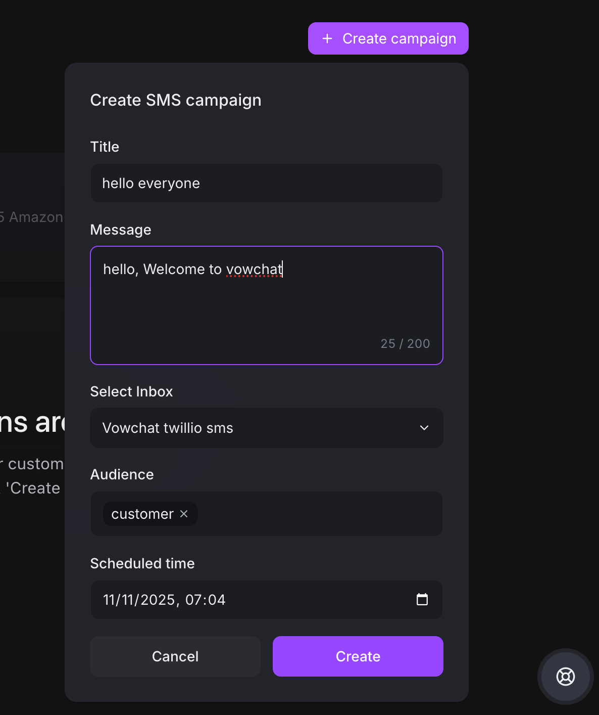Campaigns are a feature for sending outbound messages to customers. VowChat supports two types of campaigns: