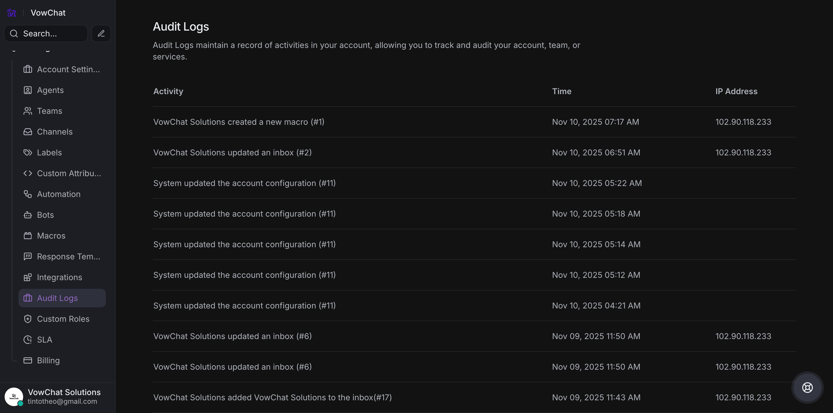 Audit logs provide visibility into all administrative activities on your VowChat account.