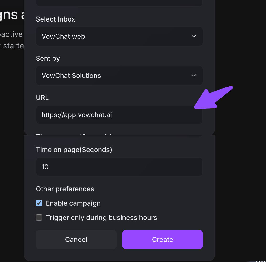 VowChat allows flexible URL pattern matching for website live-chat campaigns, enabling precise control over where chat campaigns appear.