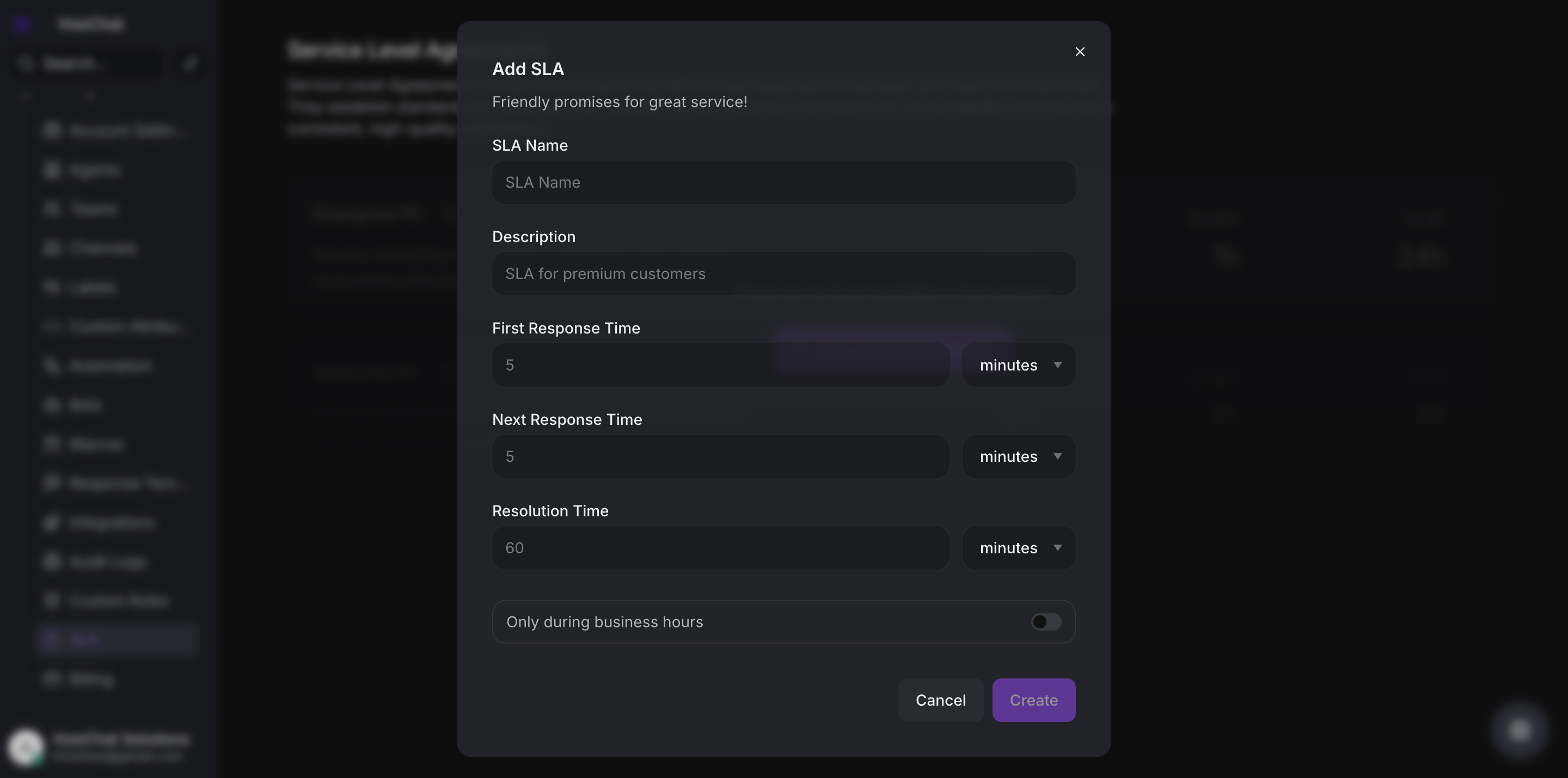 Conversations near SLA thresholds display visual chips/indicators in the UI to help track and manage response/resolution progress.