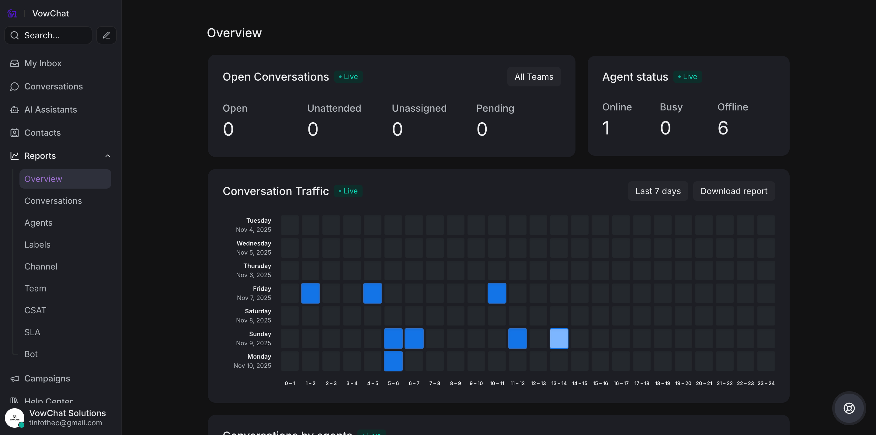 The overview provides a real-time update of what is happening in your account, giving managers instant visibility into customer support operations.