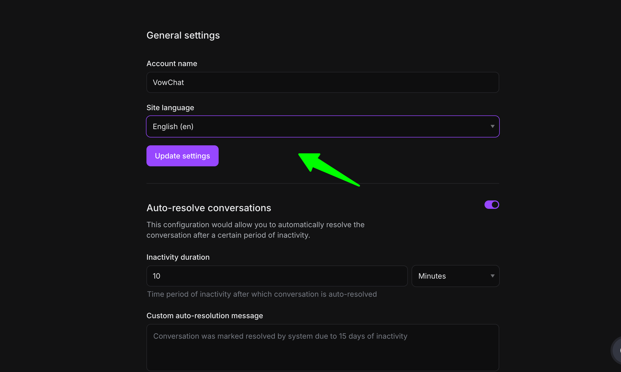 Note: Currently, VowChat does not support language selection at the agent level. The language setting applies account-wide.