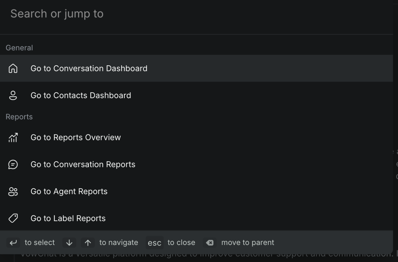 The command bar in VowChat is a productivity feature accessible via ⌘ + K (macOS) or Ctrl + K (Windows/Linux) that allows quick navigation and action execution across the dashboard.