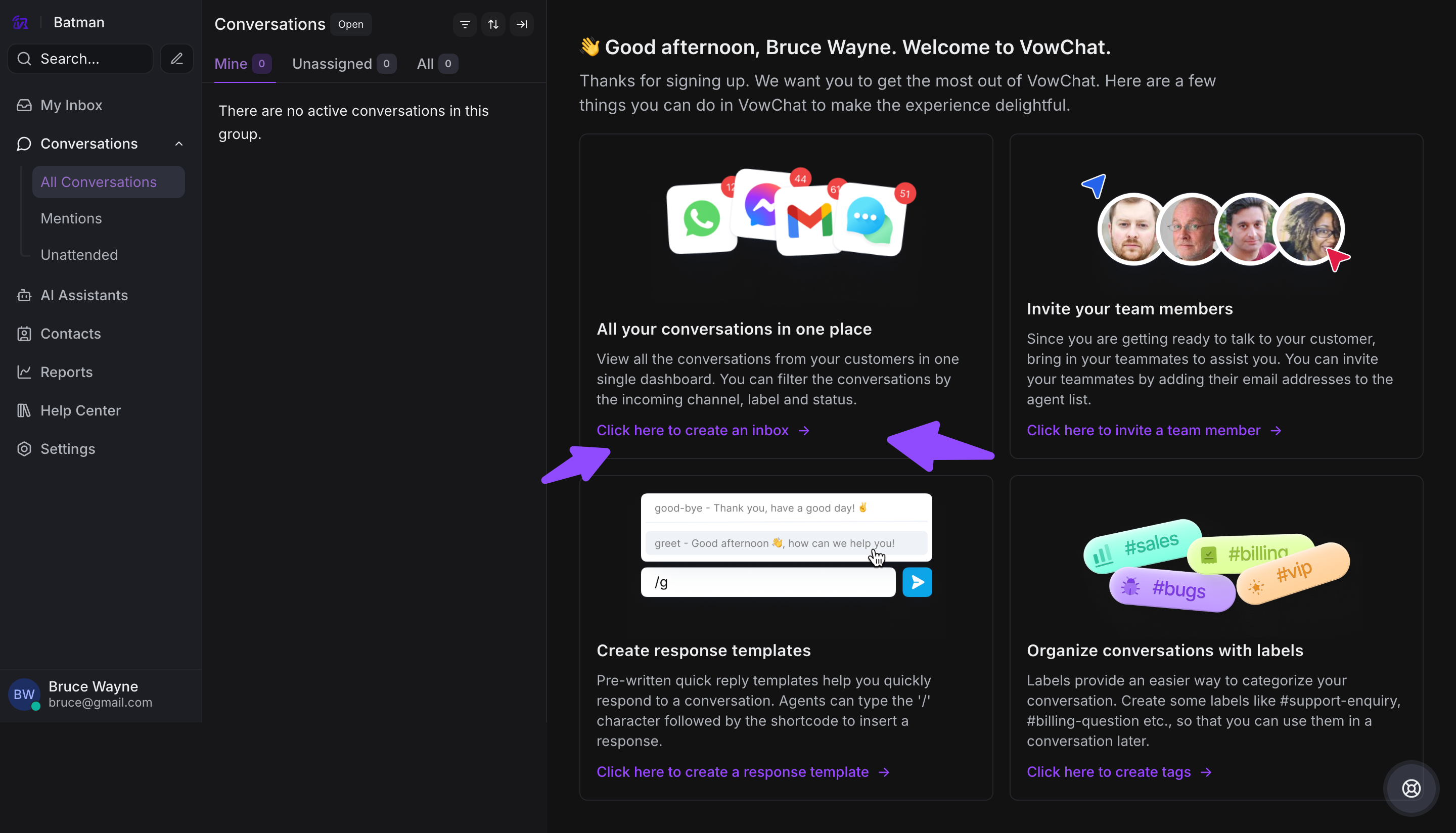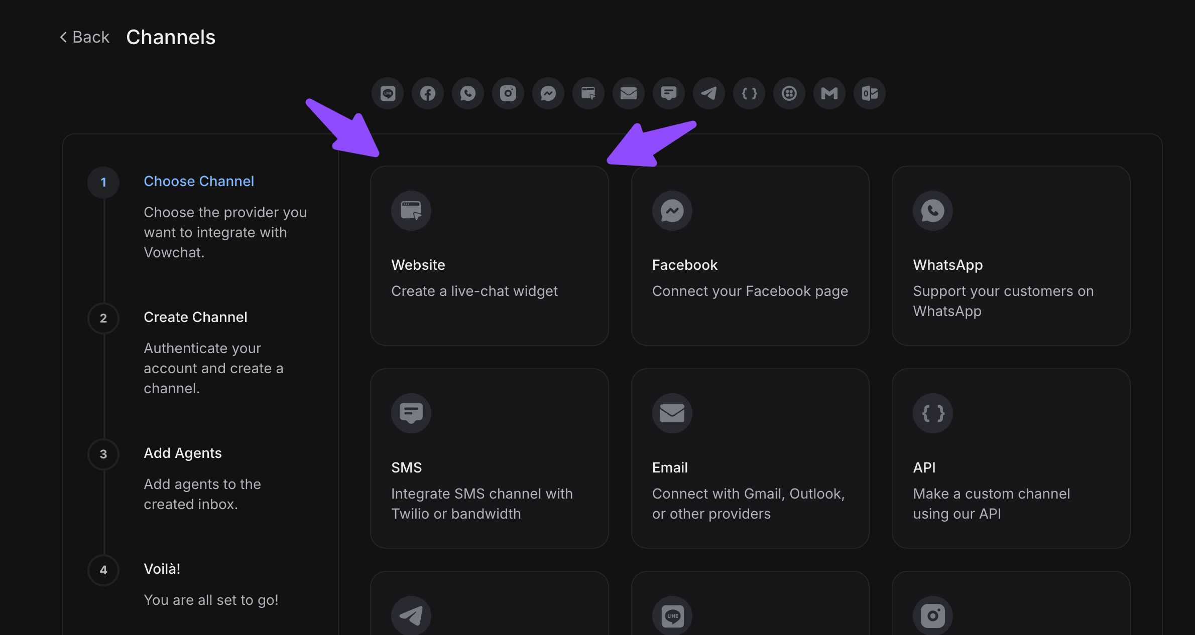A Channel is an instance that connects your website or social media accounts like Facebook, Twitter, or chat platforms like WhatsApp, Line, and more to VowChat.
