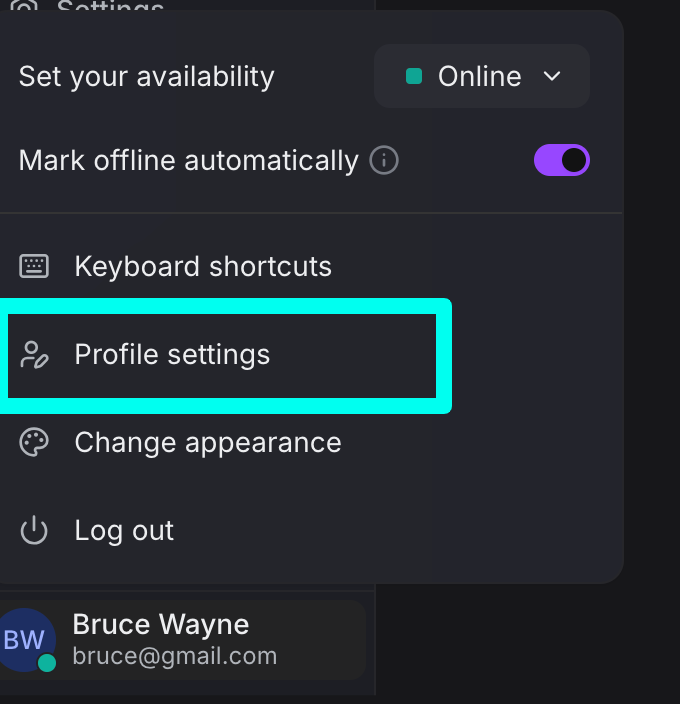 Your personal profile settings can be found on the bottom left corner of your dashboard. These settings affect how you appear on the dashboard, live-chat widget, and all external communication emails.