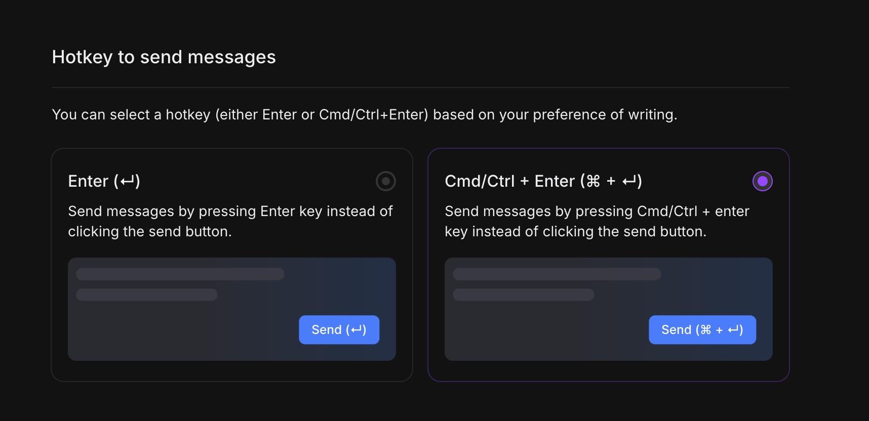 Cmd/Ctrl+Enter - Press Cmd (Mac) or Ctrl (Windows/Linux) + Enter to send
