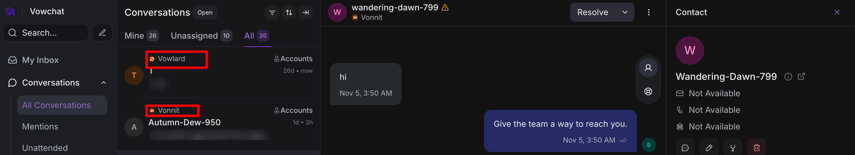 Based on the channels you choose for your organization, your customers can contact you from any of them. When someone sends a message, it becomes a new conversation in VowChat, listed chronologically on your dashboard.