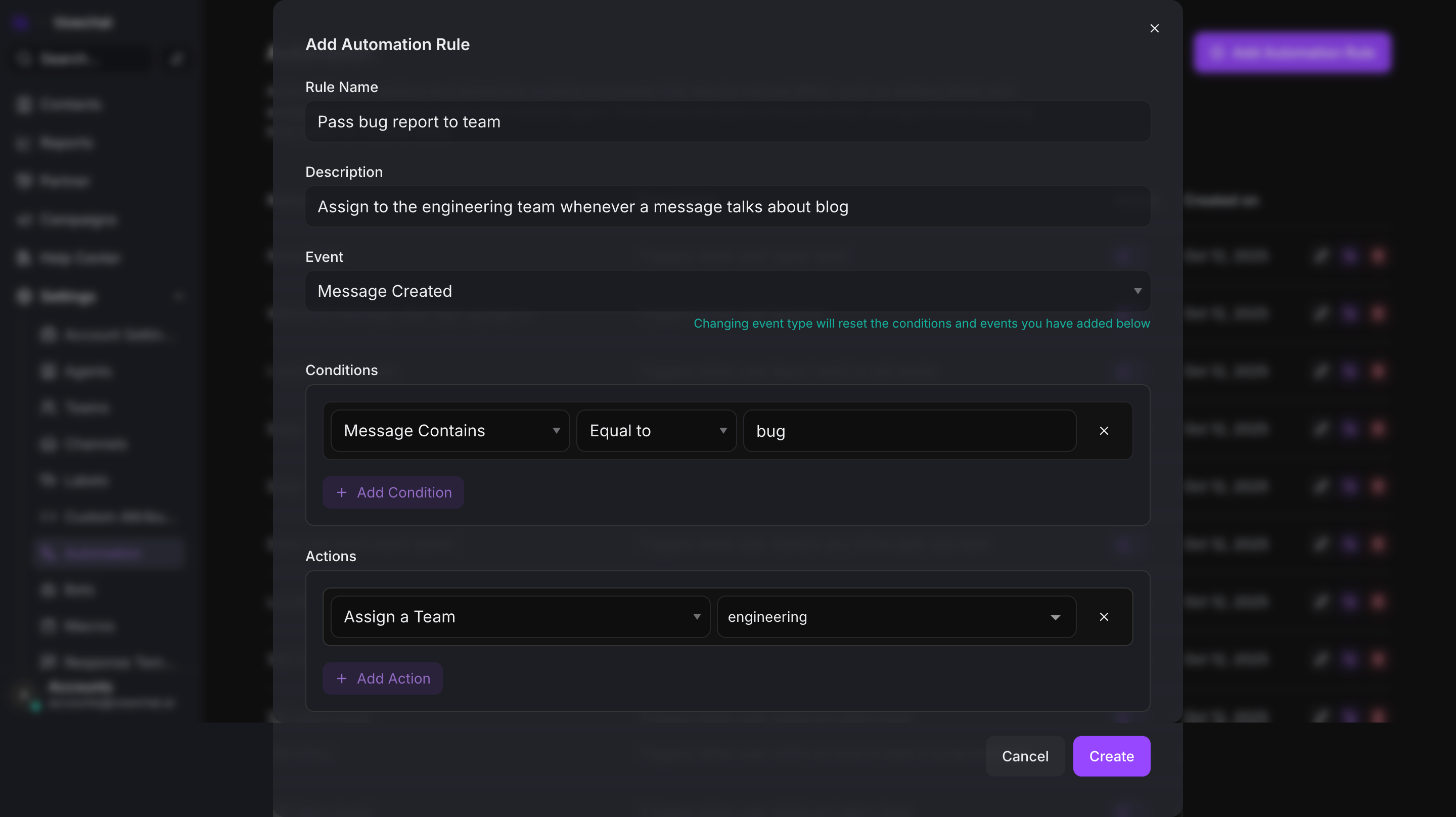 If the message contains keywords like "bug" or "error", automatically assign to the Engineering team.