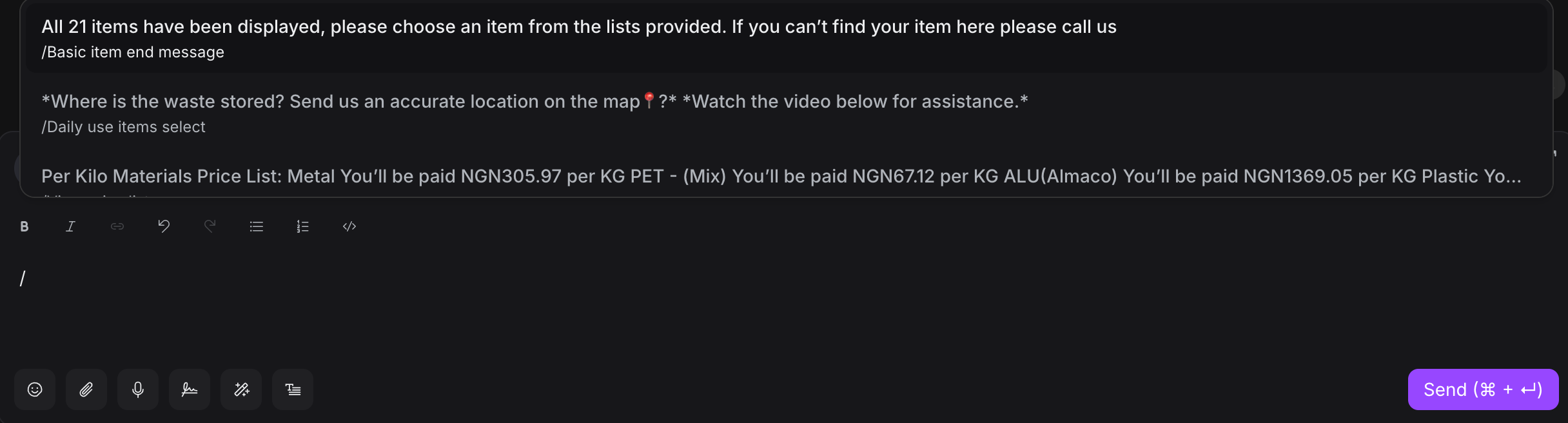 Step 1. In a conversation, type / in the reply box. This will display all available response templates.