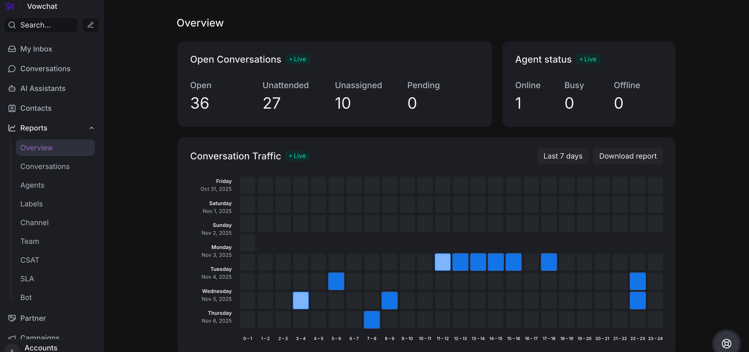 VowChat offers seven comprehensive report types to help you understand your support performance and make data-driven decisions.